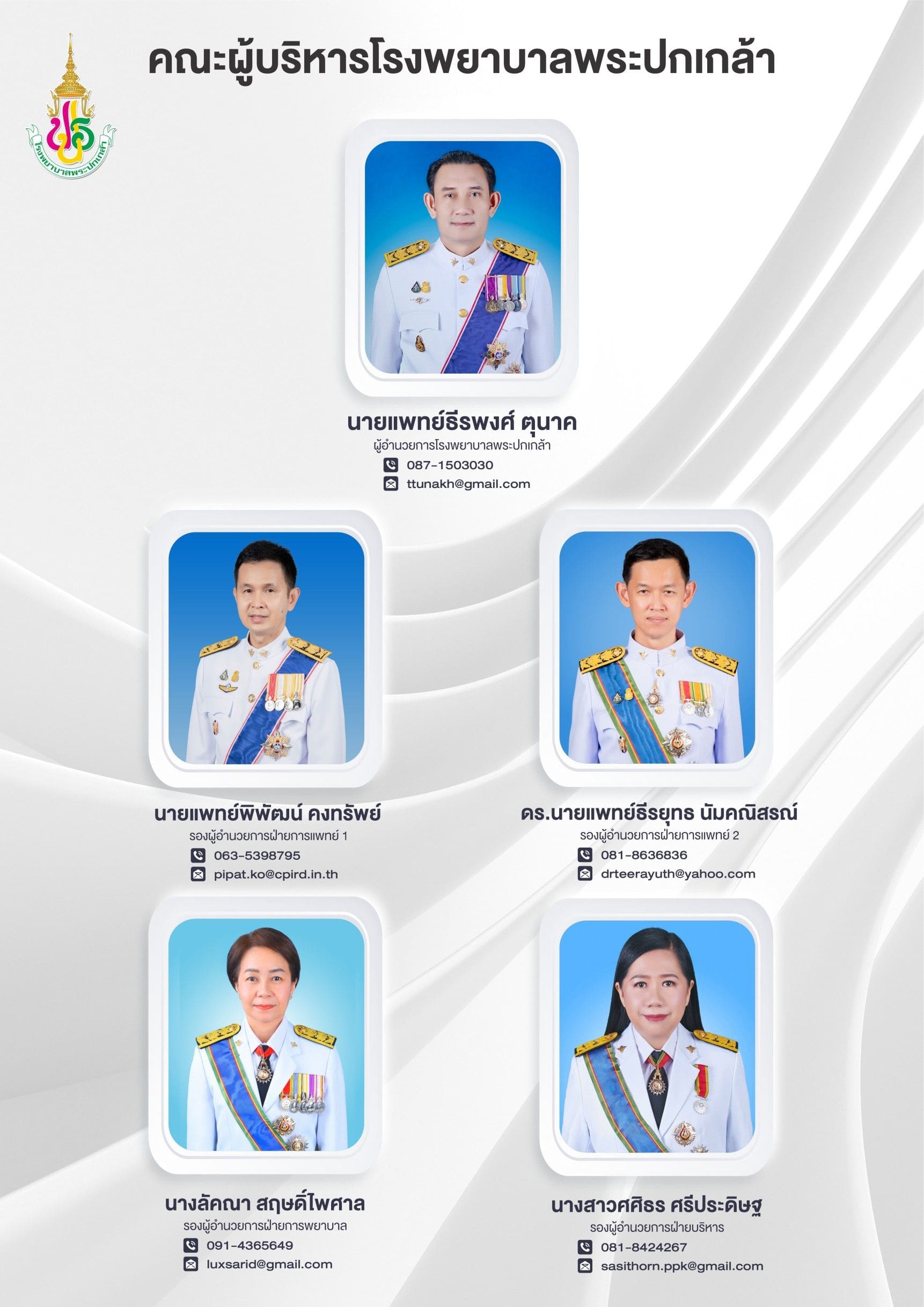1.1 1.1 ข้อมูลผู้บริหาร แสดงรายนามของผู้บริหารของหน่วยงาน ประกอบด้วย รูปถ่าย ชื่อ-นามสกุล ตำแหน่ง และหมายเลขโทรศัพท์