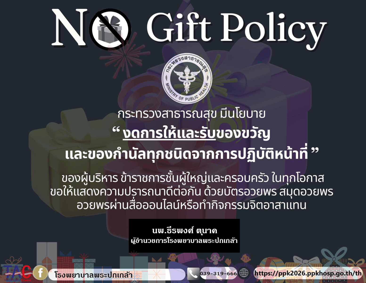 1.2 1. ประกาศเจตนารมณ์เป็นหน่วยงานที่เจ้าหน้าที่ของรัฐทุกคนไม่รับของขวัญและของกำนัลทุกชนิดจากการปฏิบัติหน้าที่ (No Gift Policy) ของปีงบประมาณ พ.ศ. 2568 ที่มีลักษณะเป็น Infographic No Gift Policy ในนามหัวหน้าหน่วยงานอยู่หน้าเว็บไซต์หลักของหน่วยงาน